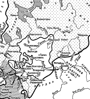 Взгляните на эту карту из школьного учебника "История России". Так выглядело наше Отечество на перевале ХV - ХVI веков. Уже позади Куликовская битва и целый век окончательной "зачистки" страны от монголо-татар - дикого степного этноса. Уже окончательно присоединены к Великому княжеству Московскому необъятные земли Великого Новгорода, и родилось единое, сильное и независимое государство Россия. Уже Ивана III, Васильевича, сменил на престоле Василий III, и летописцы писали о чувствах своих современников так: "Наша великая русская земля освободилась от ига... и начала обновляться, как будто перешла от зимы к тихой весне. Она снова достигла своего древнего величества, благочестия и спокойствия, как при первом князе Владимире".