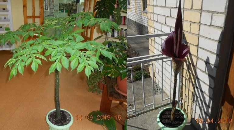 После периода покоя, в конце лета из клубня появился толстый зелёный, пятнистый стебель, увенчанный огромным сложно-рассеченным листом, очень похожим на экзотическую пальму. Растет очень быстро, за три недели он вырос на целый метр! Растение работает барометром, и перед дождем на кончиках кроны из листьев появляются капельки воды. Работники библиотеки с интересом наблюдает за его ростом и развитием.