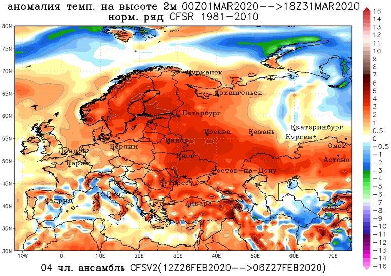 Начало марта также будет достаточно теплым, а в целом, месяц ожидается близким к норме или чуть холоднее. (см. карту распределения аномалий температуры по прогнозу модели CFS)