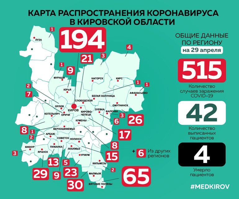 У ближайших соседей количество заболевших: в Яранском районе - 29, в Советском районе - 9, в Арбаже - 2, Орлове - 2, Оричах - 7.