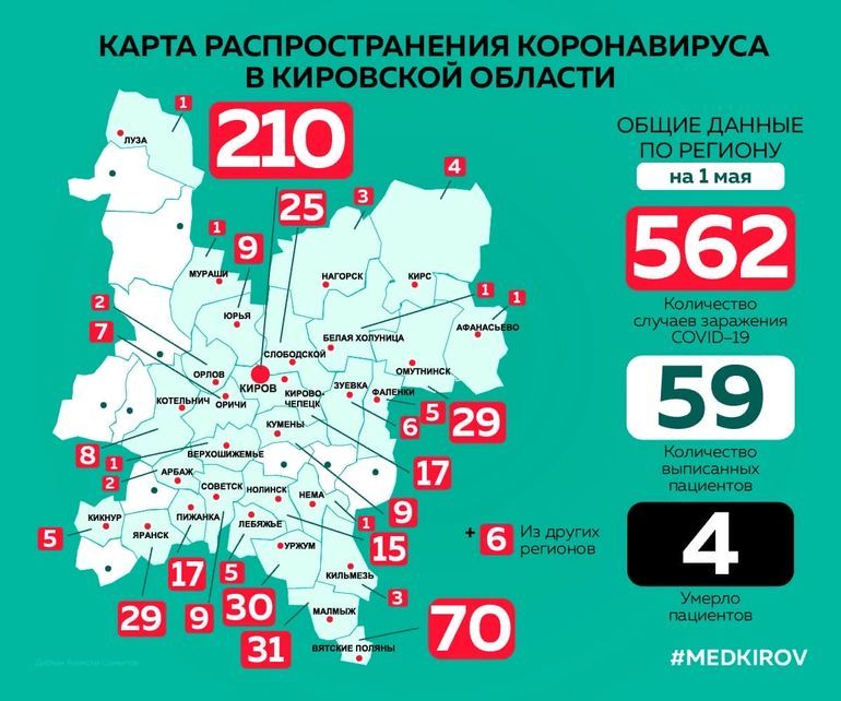 У ближайших соседей количество заболевших также осталось без изменений: в Яранском районе - 29, в Советском районе - 9, в Арбажском - 2, Орловском - 2, Оричевском - 7.