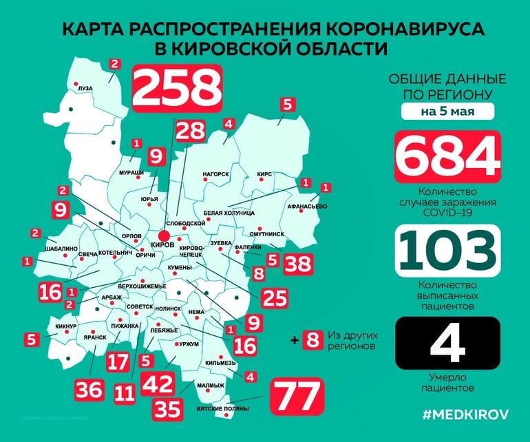 У ближайших соседей количество заболевших: в Яранском районе - 36, в Советском районе - 11, в Арбажском - 2, Орловском - 2, Оричевском - 9.