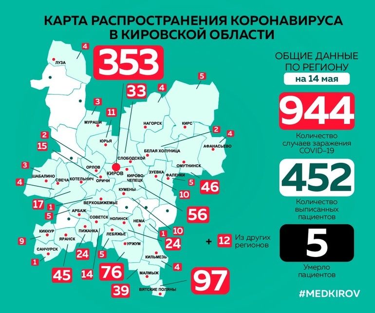 У ближайших соседей количество заболевших также не изменилось: в Яранском районе - 45, в Советском районе - 14, в Арбажском - 5, Орловском - 2, Оричевском - 15.