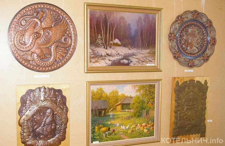 На выставке представлено более 60 работ известного котельничского художника. Интересно, что картины, выполненные в разной технике, размещены рядом.