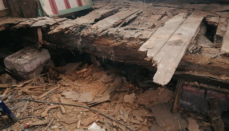 Старый двухэтажный кирпичный дом ни разу не ремонтировался. С годами здание просело, талые воды стали затапливать подвал. Из-за сильной влажности в подвале прогнили доски. А потом обвалился и пол в квартире женщины. Сделать ремонт за свой счет она не может, так как живет на пособие по инвалидности.