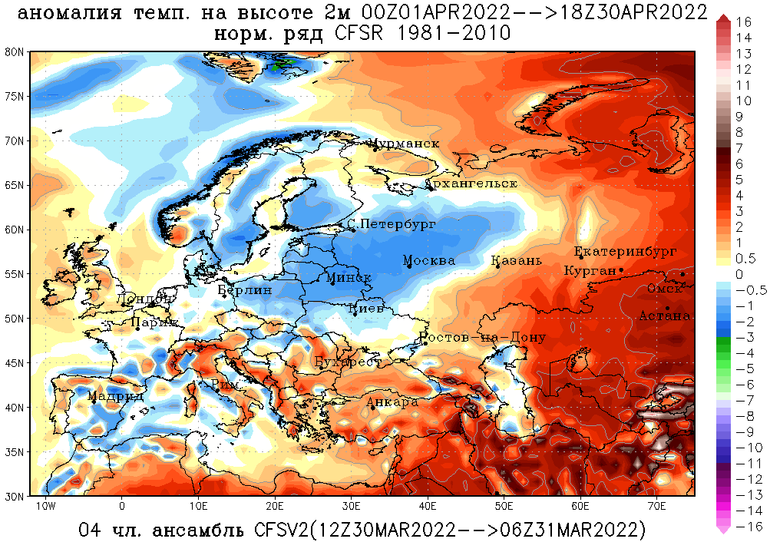 Но есть и хорошие новости. Уже с середины будущей недели ожидается потепление. Вообще, по долгосрочному прогнозу модели CFS средняя температура апреля будет около нормы (см. карту распределения аномалий температуры)