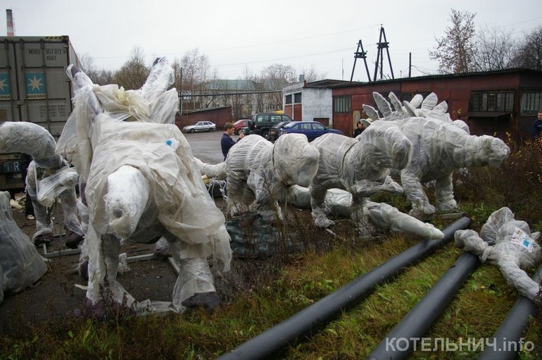 Как уже сообщал КОТЕЛЬНИЧ.info, в процессе перевозки три динозавра были повреждены. Этот факт запротоколирован совместно с представителями компании-перевозчика («РЖД Логистика») Весь груз застрахован, поэтому сейчас будут готовиться документы в страховую компанию для получения компенсации ущерба.