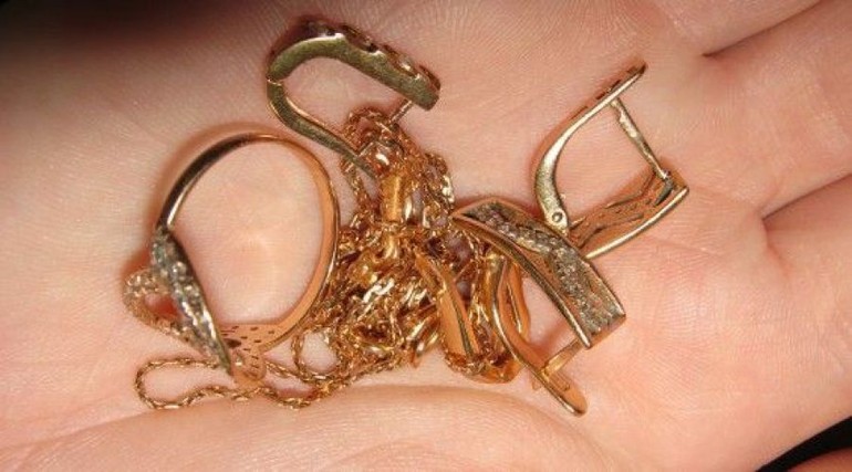 При движении по следу полицейские обнаружили несколько золотых колец, скорее всего, грабитель на бегу перекладывал золото с планшета в карманы и часть украшений выронил.