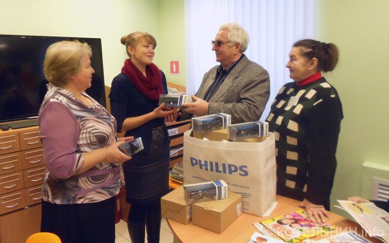 (на фото заместитель генерального директора ООО "Вымпел-М" по социальной работе Виталий Земцов передает очки сотрудникам библиотеки)