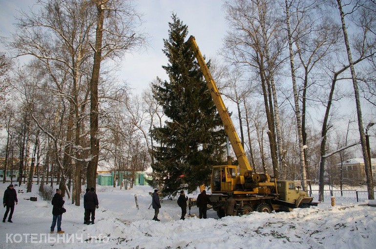 В этом году елку поставили дней на десять раньше. Как пояснил порталу КОТЕЛЬНИЧ.info Павел Сухих это сделано по двум причинам. Во-первых, хотелось раньше создать у котельничан праздничное новогоднее настроение. И во-вторых, в прошлом году в конце декабря были сильные морозы и ёлку пришлось ставить дважды. Первая новогодняя красавица «порастеряла» всю свою красоту, пока ее везли — на сильном морозе ветки отпали и осыпались. Сейчас более щадящий температурный режим и елочка прибыла к месту установки «без потерь». Нарядить ёлку хотят в конце недели. Украсят и горсад. Уже закуплены новые гирлянды, которые планируется повесить вдоль улицы Советской.