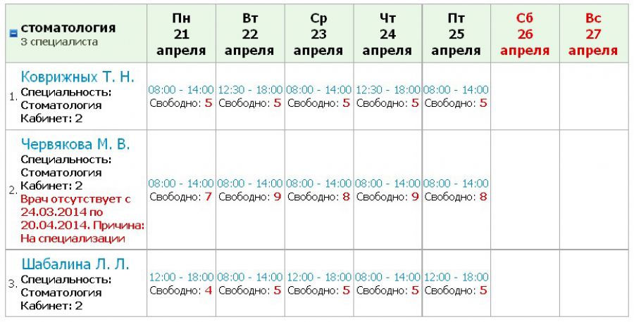 Удивительно, но похоже этому «многолетнему стоянию» приходит конец. На сайте электронной регистратуры теперь есть реальная возможность записаться на прием и в котельничскую стоматологию. Если вы запланируете полечить свои зубки, например, через месяц, то можете записаться прямо сейчас. На каждый день последней декады апреля есть более ДЕСЯТИ СВОБОДНЫХ ТАЛОНОВ!!!