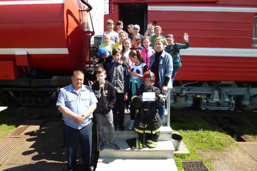 В ходе экскурсии школьники посетили пожарный поезд станции Котельнич. Начальник пожарного поезда Сергей Обухов рассказал о подготовке и работе пожарной команды, а также напомнил детям о неукоснитешльном смоблюдении правил пожарной безопасности на природе летом при жаркой и сухой погоде. Школьникам была предоставлена возможность осмотреть салоны поезда и ознакомиться с спецоборудованием состава. Ребята смогли примерить форму железнодорожных пожарных.
