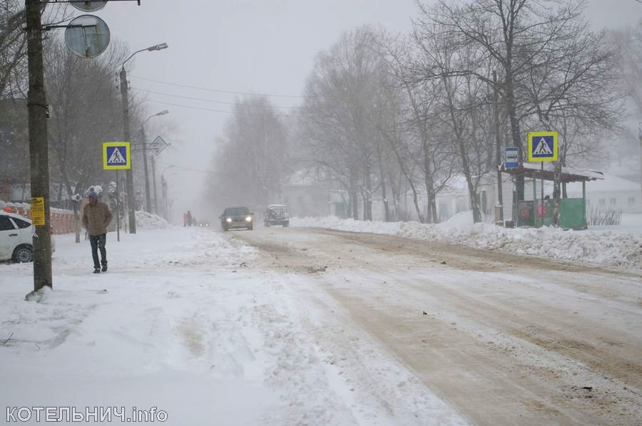 Котельнич полностью заметен снегом. Горожане ходят по проезжей части дорог. Автомобилей практически нет.