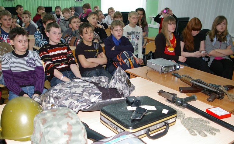 Также, школьники смогли подержать в руках автомат Калашникова, резиновую дубинку, (которая на профессиональном жаргоне, оказывается, называется «аргумент») примерить титановую каску, бронежилет и специальные кольчужные перчатки, защищающие руки от холодного оружия.