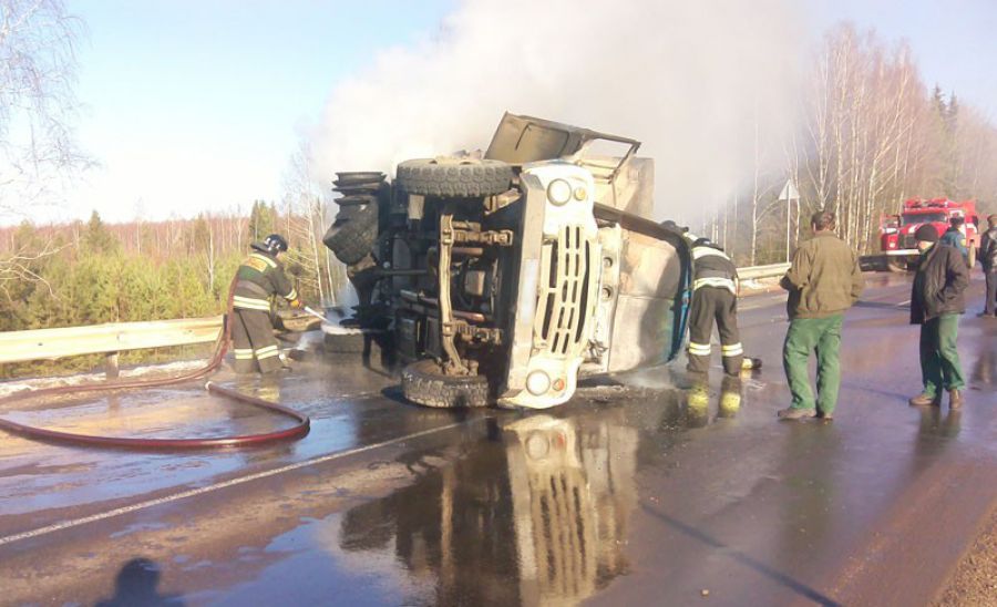 Пожарные и сотрудники ГИБДД незамедлительно отвели людей от места происшествия на безопасное расстояние и перекрыли движение на трассе. Затем огнеборцы оперативно ликвидировали воспламенение. Водитель в результате ДТП не пострадал.