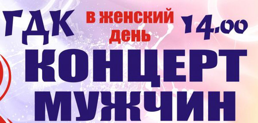8 марта в городком Доме культуры выступят мужчины. Концерт пройдет с 14:00. На сцене Владимир Арефьев, Павел Сухих, Анатолий Васенин, Алексей Аммосов, Андрей Вылегжанин и многие другие. Цена билета 100 рублей.