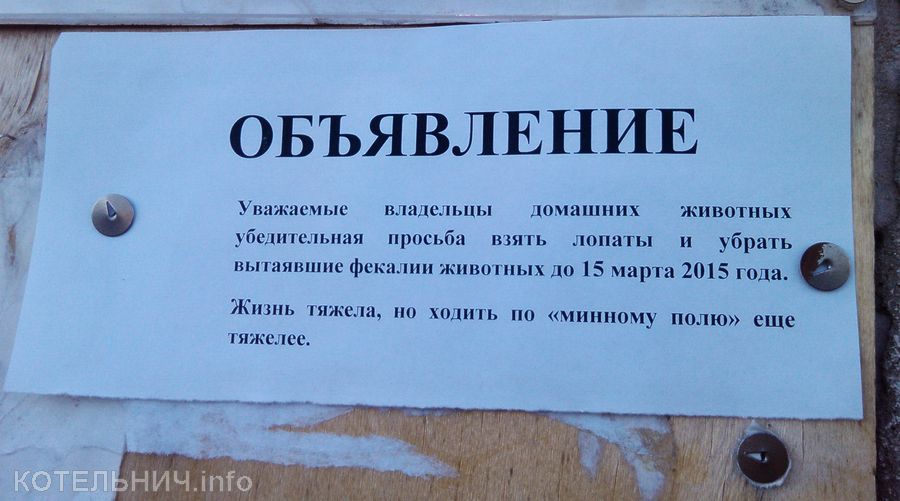 Объявление у подъезда одного из многоквартирных домов Котельнича. Судя по всему, тяжелая жизнь должна была закончиться еще вчера.