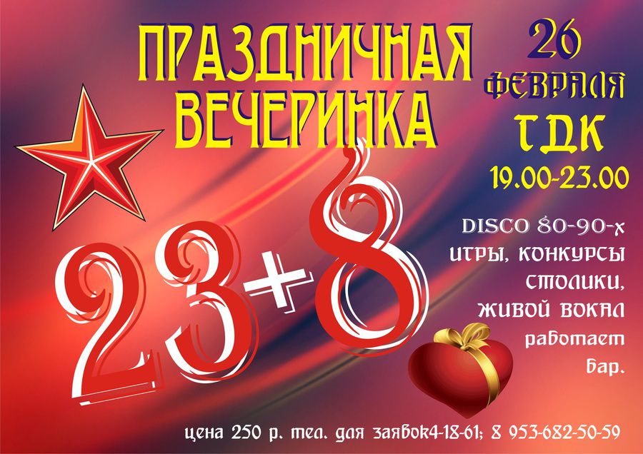 26 февраля, с 19:00 до 23:00 в ГДК пройдет праздничная вечеринка "23+8". Цена билета 250 рублей.
