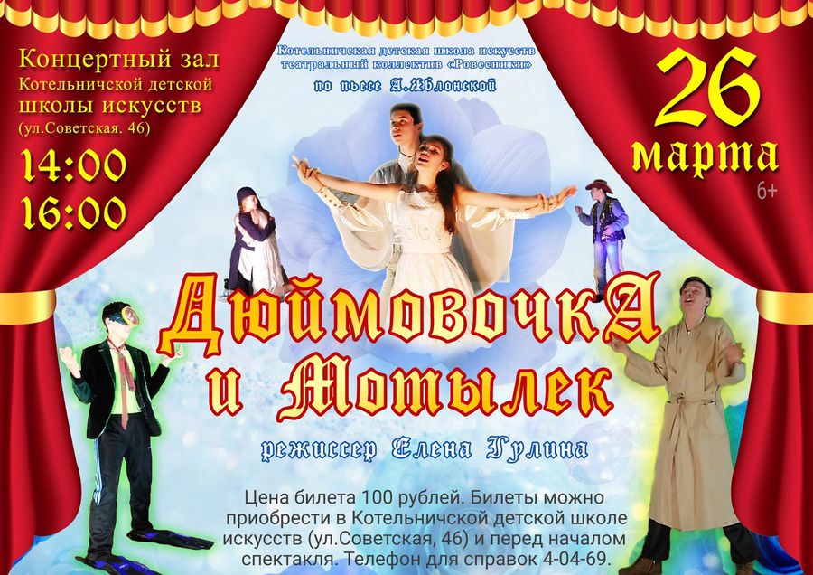 26 марта Котельничская детская школа искусств и театральный коллектив «Ровесники» представят новый спектакль по пьесе А. Яблонской «Дюймовочка и мотылек».