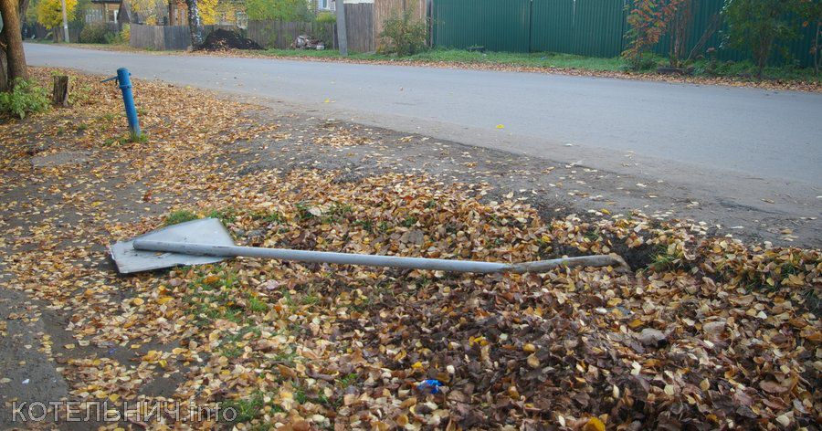 Написал Котельничанин: Дорожный знак на улице Пушкина "лёг" уже во второй раз. Его уже поднимали, но сил стоять у него, видимо, совсем не осталось. Кварталом ниже - на перекрестке Свободы и Луначарского из четырех знаков стоит один. Остальные валяются где-то рядом.