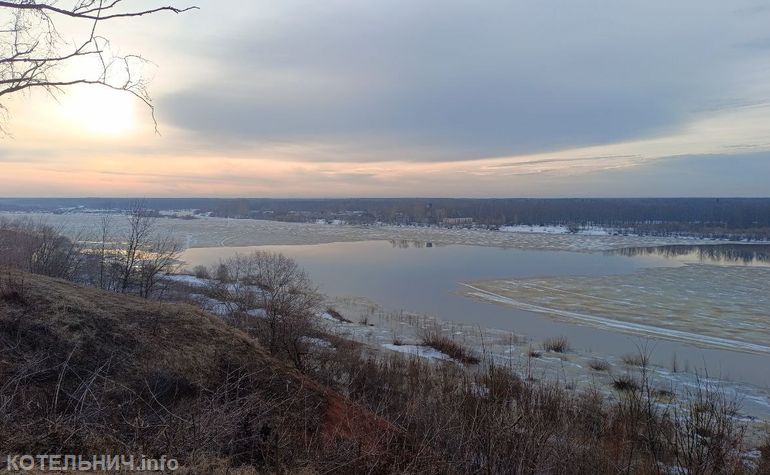 Напротив набережной образовалось пространство открытой воды. Вскрытие произошло при достаточно высоком уровне — 191 сантиметр от нуля поста наблюдения. По данным котельничской метеостанции, за сутки уровень воды поднялся еще на 25 сантиметров и утром 2 апреля составил 216 сантиметров.