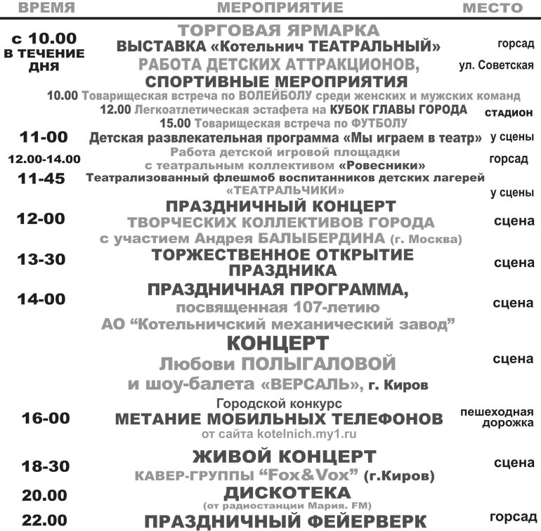 12 июня в горсаду котельничане отметят День города. Праздник начнется с 10:00. Работают детские аттракционы, пройдут спортивные мероприятия, перед котельничанами выступят Андрей Балыбедин, котельничские творческие коллективы, артисты из города Кирова.